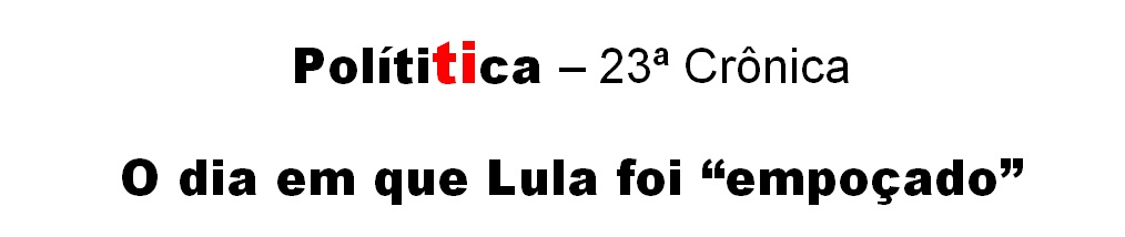 Devidamente embevecido por aquela atmosfera gregoriana, cada participante do pobre e carente povo, subliminarmente, também bebeu um gole do vinho Romanée-Conti e deu uma pitada no charuto cubano que Lula ganhou de Fidel Castro, da mesma forma como arrota diariamente quando assiste, submetido a uma completa hipnose (catarse coletiva), a um banquete na novela das oito. O Marketing político sabe que o povo é gregário, por isso, não tirou o embuço da cara do Lula. Nem vai tirá-lo nos próximos quatro anos. Cairá por si. O dia 1º de janeiro de 2003 vai ficar marcado definitivamente na história política brasileira como “O dia em que Lula foi empoçado”.