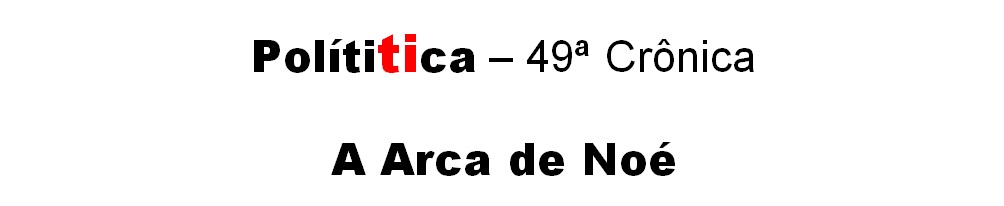 Vou trabalhar no varejo daqui pra frente e colocar dentro dela, a arca, matérias a retalho. Assim como na verdadeira arca faltaram alguns bichos de estimação de Noé, provavelmente eu me esqueça de citar determinadas informações. Acho melhor assim, porque elas não teriam chance de desembarcar no porto Brasil (Ilha da Fantasia) e ficariam à deriva, contra a vontade do comandante da arca.