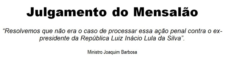 O STF decidiu não incluir o ex-presidente Luiz Inácio Lula da Silva como réu no Processo do Mensalão, Ação Penal nº 470. Retrospectiva das nomeações: 06 Ministros foram nomeados por Lula (Joaquim Barbosa, Ricardo Lewandowski, Carlos Ayres Britto, Cezar Peluso, Cármen Lúcia, Dias Toffoli); 02 Ministros foram nomeados pela atual presidente Dilma Rousseff (Luiz Fux e Rosa Weber); 01 Ministro foi nomeado pelo ex-presidente Fernando Henrique Cardoso (Gilmar Mendes); 01 Ministro foi nomeado pelo ex-presidente Fernando Collor de Mello (Marco Aurélio Mello) e 01 Ministro foi nomeado pelo ex-presidente José Sarney (Celso de Mello, o decano do Supremo Tribunal Federal, ou seja, o mais antigo membro da Corte).