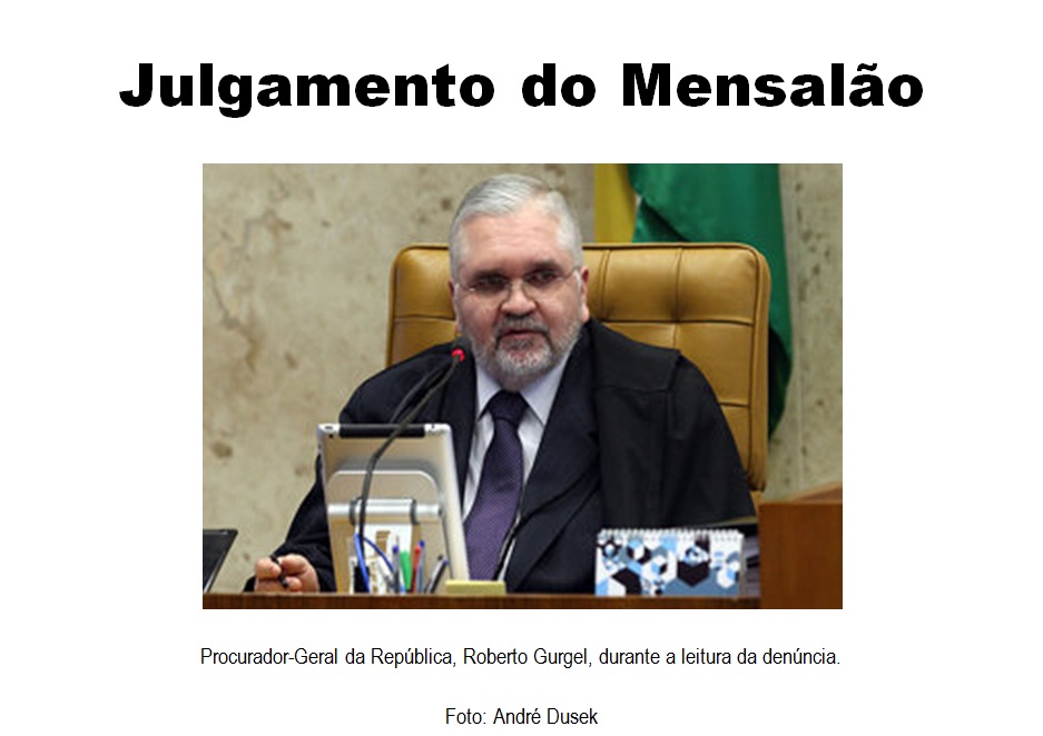 O Procurador-Geral da República, Roberto Gurgel, sob uma atmosfera de silêncio absoluto, fez a sua sustentação oral da acusação dos réus do Mensalão dentro do tempo regimental de cinco horas a que tinha direito. Descreveu detalhadamente, e com muita propriedade, o Modus operandi da dita suposta quadrilha. Tipificou os crimes – Em Direito Penal, ação de associar a conduta do agente ao tipo penal. Nesse momento, a bandeira do Brasil, que estava postada atrás da cadeira de Roberto Gurgel, sangrava. O maior escândalo político da história brasileira recente é rico tema para escritores de enredo policial, de dar inveja às maiores agências de investigação do planeta. Segundo o que foi demonstrado no relatório da acusação, três núcleos foram criados – Político, Financeiro e Operacional – para que as operações da organização criminosa corressem dentro das “normas técnicas” e não sofressem solução de continuidade.