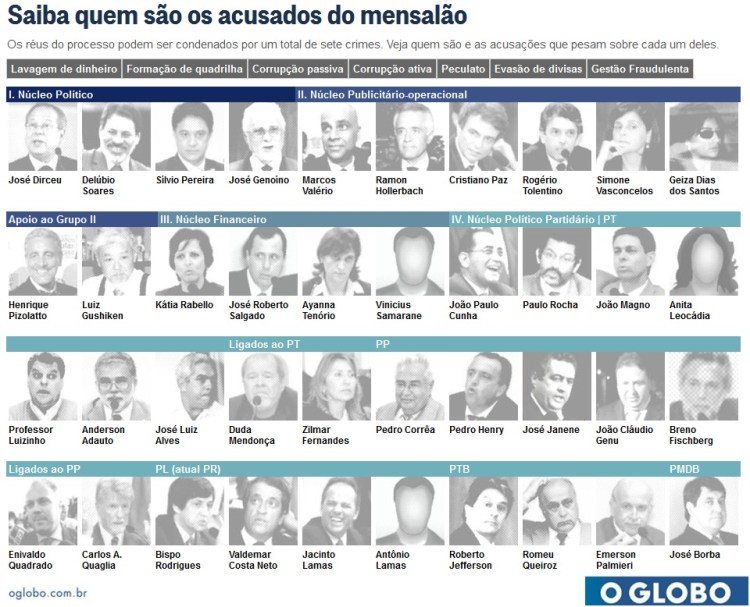 Com os devidos créditos, parabenizo o trabalho realizado por O GLOBO PAÍS, no que se refere à divulgação de importantes informações sobre o julgamento da Ação Penal nº 470 – Processo do Mensalão. Clique na imagem abaixo para acessá-las, em seguida clique em qualquer uma das fotos dos réus para maiores detalhes e não deixe de ler a defesa completa (Alegações Finais) do réu em pdf.