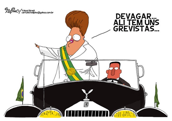Por que será que o Alpino tirou o militar do Rolls-Royce presidencial e trocou o motorista? Quanto ao general do Exército, eu fico calado, por segurança. Quanto ao motorista, arrisco um palpite: eu acho que o motivo foi que o motorista de cima se parece muito com o Hugo Chaves e poderia dar margem para especulações; e já que o povo gosta mais de ver desenhos do que cenas reais, o chargista Alpino deu asas à sua criatividade.
