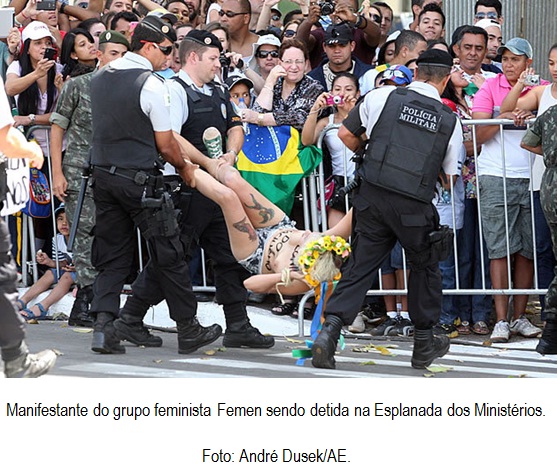 A ordem do dia dada na sexta-feira, 07 de setembro de 2012, partiu do Gabinete de Segurança Institucional da Presidência da República, GSI, para blindar Dilma Rousseff das manifestações populares e, sobretudo, dos funcionários da Polícia Federal e da Receita Federal que ainda se mantêm em greve. A população patriota foi impedida de se aproximar dos palanques oficiais, onde estavam os servidores do Palácio do Planalto e seus familiares – a ausência dos réus do Mensalão foi sentida pela maioria dos presentes. A blindagem construída em torno de Dilma Rousseff teve por objetivo fazer com que ela assistisse ao desfile do Dia da Pátria “sem protestos”, mesmo sabendo que as manifestações públicas estavam bem perto dali, mas sem serem vistas, ouvidas e sentidas, portanto, as democráticas vaias e as faixas com mensagens sugestivas ficaram confinadas atrás dos sutis e românticos tapumes que foram colocados em toda a extensão da Esplanada dos Ministérios. A presidente dos pobres miseráveis, dos excluídos, dos alagados sem sal e dos dependentes do programa de compra de votos Bolsa Família, não esperou a apresentação da Esquadrilha da Fumaça, atendendo ao toque de recolher dado pelos seguranças as 11h00min, sob a suspeita de que a “Quadrilha Esfumaçante do Mensalão” havia tomado o lugar dos pilotos da FAB. O herói da resistência Agnelo Queiroz, governador do Distrito Federal pelo queimado PT, foi a bola da vez, recebendo uma saraivada de vaias. Encerrado o desfile militar, a “Marcha contra a Corrupção” entrou na passarela do samba com alguns milhares de brincantes (talvez umas 10 mil pessoas). Esta sim foi a maior e melhor festa. Independência ou Morte!