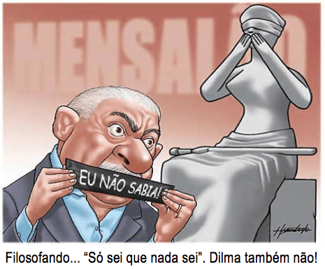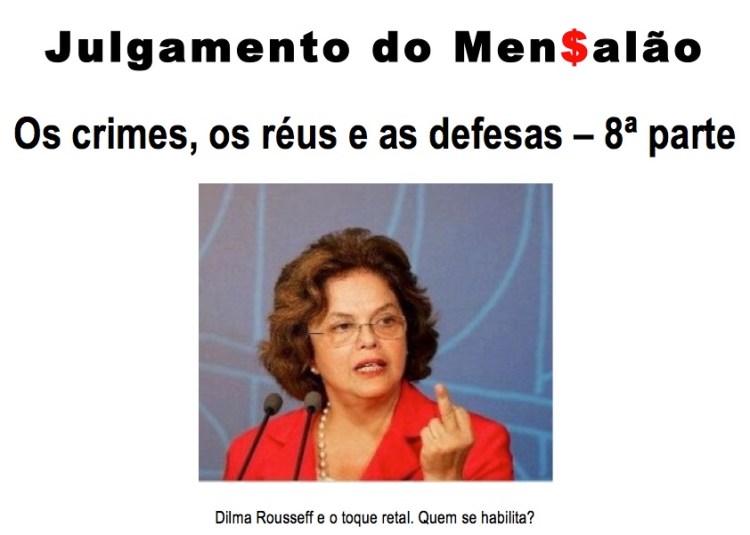 Sinceramente, eu não vi obscenidade no ato da presidente herdeira de Lula; de modo que julgo uma atitude normal. Ela traz a público a forma como trata a plêiade de Ministros sob o seu comando. Com efeito, vamos ao que interessa ao público que fará exame de próstata. Onde estava a presidente Dilma Rousseff quando estourou o escândalo do Mensalão? Esta pergunta não quer calar. A resposta é bem simples, participando ativamente do governo Lula, desde o seu primeiro dia de mandato como presidente da República. Em entrevista exclusiva ao jornal Folha de São Paulo, em junho de 2005, o então Deputado Federal Roberto Jefferson (PTB/RJ) denuncia o esquema do Mensalão. Naquele mesmo mês, o homem de confiança de Lula, José Dirceu, deixa o governo, ou seja, pede demissão do Ministério da Casa Civil; na verdade, pediu exoneração alegando como fundamentos motivos de cunho pessoal que não necessitavam ser revelados – expediente corriqueiro para inglês ver e ficar bem na fita. Dilma Vana Rousseff, em 21 de junho de 2005 assume como Ministra-Chefe da Casa Civil no lugar de José Dirceu, onde ficou até 31 de março de 2010, quando saiu para se lançar candidata a presidente e, portanto, articular a sua campanha política. Pois bem, Dilma Rousseff antes de assumir a Casa Civil era Ministra das Minas e Energia, cargo que ocupou entre 01 de janeiro de 2003 a 21 de junho de 2005. Foi só trocar de porta e de sala. Como disse, Dilma Rousseff foi Ministra de Lula desde o seu 1º dia de governo, desde o 1º mandato, em 01 de janeiro de 2003. Infiltrada nas entranhas do PT (Pronto pro Toque), perdão, do governo Lula, até que ponto ela tinha conhecimento das ações criminosas praticadas pela quadrilha de Marcos Valério & Cia Ltda? Puro mistério. Sem a pretensão de ser apologista da “Teoria da Conspiração”, pairam dúvidas danadas na minha cabeça, ou melhor, nascem minhocas de pura raça: À Dilma Vana Rousseff, caso soubesse do esquema do Mensalão, poderíamos imputar os crimes de responsabilidade, de omissão ou comissão, ou crime de omissão por comissão? Deixa pra lá! Ela já respondeu acima, é só ver a foto inocente, descompromissada com posturas oficiais e/ou protocolares.