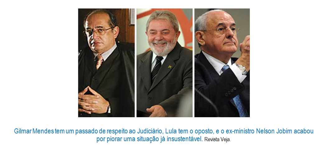 Por que Lula assediou acintosamente o Ministro Gilmar Mendes? Por que Lula não se valeu dos Ministros por ele nomeados (Carlos Ayres Britto, Joaquim Barbosa, Ricardo Lewandowski, Dias Toffoli e Cármen Lúcia) para atingir o seu objetivo de postergar, de melar, o julgamento do Mensalão? Dentre tantas conclusões, destaco meia dúzia: 1ª) Atitude desesperada, própria de uma pessoa sem princípios, tresloucada, não compromissada com o respeito, com a ética, com a moral, os bons costumes e com a história republicana; 2ª) Lula achou que todo mundo tem que orbitar sua imagem; 3ª) Lula desconsiderou a inteligência das pessoas; 4ª) Lula trocou os pés pelas mãos e permaneceu na posição de quatro; 5ª) Lula considerou que o programado encontro furtivo fosse guardado em segredo, como tantos acontecidos no Palácio do Planalto com os membros da quadrilha do Mensalão e interessados; 6ª) Com apenas um tiro, Lula atingiria, de uma só vez, duas importantes figuras do cenário nacional, ou seja, um eminente Ministro com um passado de respeito ao Judiciário, e o ex-presidente da República Fernando Henrique Cardoso, que nomeou Gilmar Mendes para o Supremo Tribunal Federal em 20 de junho de 2002. Por compreensão, Lula apostou na desqualificação e na falta de crédito do STF caso Gilmar Mendes caísse em tentação. Quanto à sigla partidária inimiga, capitulando Gilmar Mendes, por ligação, Lula estaria comprometendo o PSDB de FHC. Para a materialização do intento diabólico, necessitaria de uma testemunha de destacado peso, e foi escolhido o ex-ministro Nelson Jobim, que já ocupou a posição de Presidente do Supremo Tribunal Federal, com mandato de 19 de maio de 2004 até 29 de março de 2006. Convém destacar que o gesto criminoso, premeditado por Lula, teve um propósito. Instrumentalizando a política, certamente Lula estaria aparelhando o Estado segundo seus desígnios, o que acabou fazendo. A cargo do Marketing Político, dirigido por profissionais da comunicação subliminar, ficou a produção de campanhas voltadas à idolatria do miserável nordestino retirante, que se tornou abastado no oásis da política brasileira. Essa realidade afasta qualquer suspeita de xenofobia.
