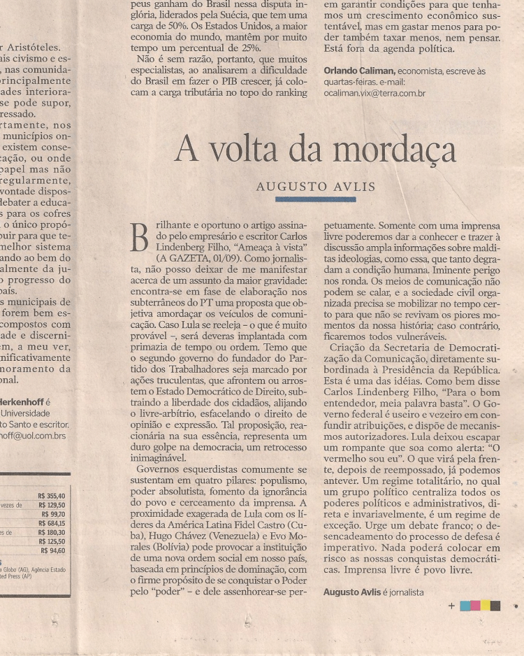 O momento é oportuno para resgatar um artigo de minha autoria de título “A volta da mordaça”, publicado pelo jornal A GAZETA, na coluna Opinião, página 03 – Vitória (ES), quarta-feira, 13 de setembro de 2006 (Leia abaixo). Nesta mesma página, brilhante editorial de título “Corte ético – Câmara dos Deputados decide exonerar 49% dos ocupantes de cargos em comissão”. Seis anos faz da sua publicação, e constato como os dois assuntos estão bem atuais. Estamos vivendo um período de “Ditadura branca”, disfarçada em “Populismo assistencialista” e, infelizmente, os brasileiros ainda não se deram conta disso. Quando acordarem, pode ser que seja tarde demais. A máquina político-partidária do PT, através dos seus dirigentes, está a serviço da desconstrução lenta e contínua da Democracia, na medida da sua predisposição em dominar as massas a seu inteiro favor, em detrimento dos interesses do país.