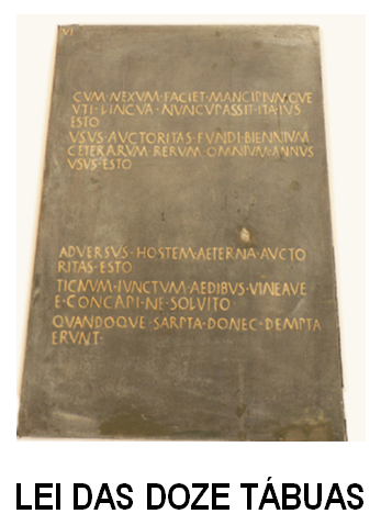 “A Lei das Doze Tábuas (Lex Duodecim Tabularum ou simplesmente Duodecim Tabulae, em latim) constituía uma antiga legislação que está na origem do Direito Romano. Formava o cerne da Constituição da República Romana e do ‘Mos Maiorum’ (antigas leis não escritas e regras de conduta). Conquanto seus originais tenham se perdido, os historiadores reconstituíram parte do conteúdo nelas existentes, através de citações em autores dos mais diversos. Com base nestes estudos, um esboço do conteúdo das Tábuas pôde ser feito. Temas: Tábuas I e II – Organização e Procedimento Judicial; Tábua III – Normas contra os inadimplentes; Tábua IV – Pátrio Poder; Tábua V – Sucessões e Tutela; Tábua VI – Propriedade; Tábua VII – Servidões; Tábua VIII – Dos Delitos; Tábua IX – Direito Público; Tábua X – Direito Sagrado; Tábuas XI e XII – Complementares”.