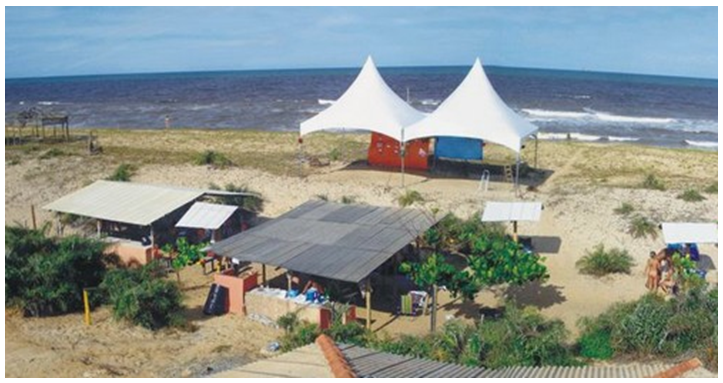 A área destinada à prática do naturismo possui: 04 sombreiros grandes e 03 sombreiros pequenos; 06 chuveiros de água doce fria; pontos de luz por toda a área; 03 pias; quadra de voley; área para acampamento e WC (Feminino e Masculino).