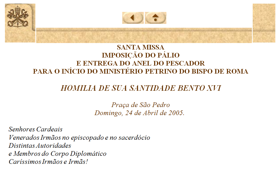 Queridos amigos! Neste momento não temos necessidade de apresentar um programa de governo. Alguns aspectos daquilo que eu considero minha tarefa, já tive ocasião de expô-los na mensagem de quarta-feira 20 de Abril; não faltarão outras ocasiões para fazê-lo. O meu verdadeiro programa de governo é não fazer a minha vontade, não perseguir ideias minhas, pondo-me, contudo, à escuta, com a Igreja inteira, da palavra e da vontade do Senhor e deixar-me guiar por Ele, de forma que seja Ele mesmo quem guia a Igreja nesta hora da nossa história. Em vez de expor um programa, gostaria simplesmente de procurar comentar os dois sinais com os quais é representada liturgicamente a assunção do Ministério Petrino; contudo, estes dois sinais refletem também exatamente o que é proclamado nas leituras de hoje.
