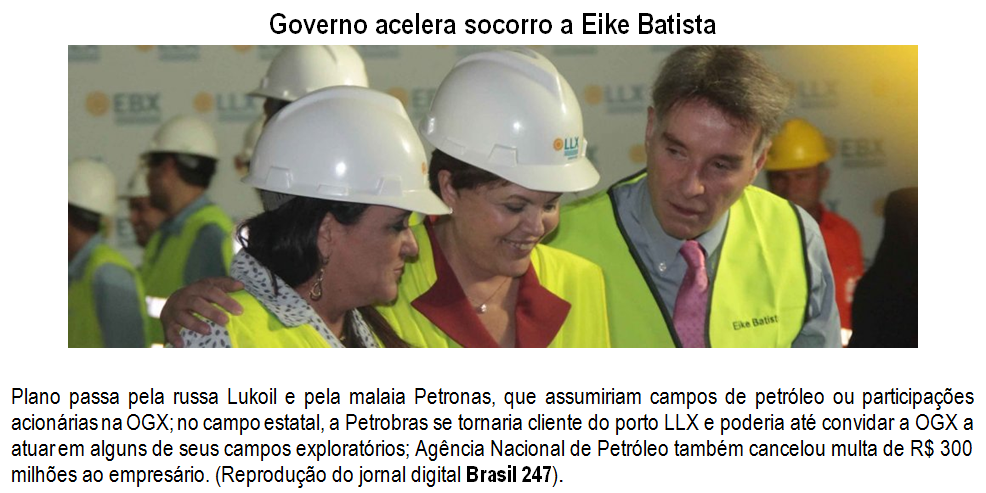 Se a ficha caiu ou não é problema dele. Isso me faz lembrar como é impressionante a reação dos eleitores, votam errado, no partido político errado, nos políticos errados, só para terem motivo de reclamar depois. É a cultura brasileira em plena manifestação. Prova disso, são os comentários que li nas redes sociais acerca da última notícia envolvendo o Palácio do Planalto em mais uma tramoia anunciada: “Governo sai a campo para salvar Eike Batista”. Não foi só na mídia impressa que a matéria recebeu destaque, também em jornais digitais como o Brasil 247, conforme podemos visualizar abaixo.