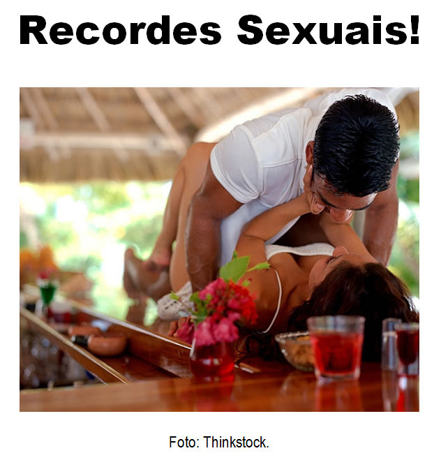 Guardei esta matéria nem sei por quanto tempo, mas, estimulado pela leitura tentei atingir a marca de mais um recorde sexual para incluí-lo na lista apresentada pelo AreaH. Mais à frente digo qual foi a minha façanha sexual. O AreaH é um Site masculino que aborda assuntos de interesse dos homens (se é masculino!) como Consumo, Relacionamento, Carreira, Viagem, Estilo, Saúde, Motores, Esportes, Entretenimento, Comportamento, Celebridades. Mulheres, Sexo, Tendências, Dinheiro e Carros estão no contexto. Gostei do Site e recomendo-o. O AreaH selecionou 12 recordes sexuais, a meu sentir alguns desafiaram as leis da natureza, outros nem tanto e determinados feitos põem em dúvida as confissões dos seus autores. Sexo é vida, prazer, a conquista do infinito, não obstante, ainda é uma incógnita, um mundo a ser descoberto, a busca incessante da plenitude. Cada um dos 12 recordes, especificamente, será objeto de artigo comentado. No contraponto, apresentarei os recordes com a minha assinatura, cujas provas materiais estão sob a guarda das parceiras eventuais.