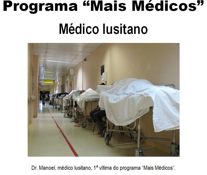 O Dr. Manoel Dutra de Oliveira Pereira, com especialidade em Clínica Geral, selecionado para trabalhar no programa federal “Mais Médicos”, na sua primeira consulta no Brasil foi duramente surrado por um homem identificado pelo nome de “Waldisneysson”, marido da consultante. O Dr. Manoel teve partes do corpo amputadas, está imobilizado e em coma induzido. Encontra-se internado no Hospital de Base de Brasília, ou melhor, sobre uma maca nos corredores aguardando vaga na UTI, o seu estado é gravíssimo, portanto, corre risco de morte. O governo Dilma Rousseff está dando todo o apoio necessário ao Dr. Manoel, segundo o estabelecido no programa “Mais Médicos”. A família do Dr. Manoel, que não autorizou a divulgação do seu rosto, já foi avisada e está de viagem marcada para o Brasil. “Com certeza, iremos entrar com um pedido formal de indenização junto ao governo brasileiro, sobretudo por danos corporais irreversíveis, de modo que não aventamos, ainda, a possibilidade do Dr. Manoel vir a óbito. Se acontecer o pior, pediremos o impeachment da vossa presidente Dilma Rousseff” – disse o advogado da família, Joaquim Braga de Alcântara Machado Moura Filho.