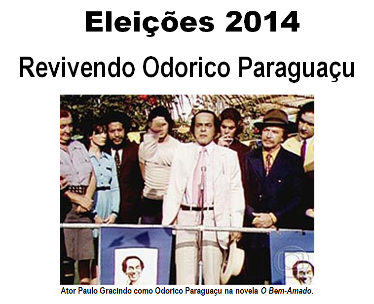 A produção da comunicação de massa se fundamenta numa estratégia de linguagem que permite mecanismos de manipulação, dominação, doutrinação, robotização e alienação, seja pessoal, grupal ou coletivamente. Manipular, dominar, doutrinar, robotizar e alienar a massa de eleitores são cinco objetivos, a meu sentir, claros, de qualquer campanha política. A atuação nociva dos Marqueteiros tem influência no sucesso ou insucesso dos candidatos. Mentiras passadas como verdades absolutas; verdades não reveladas; fatos distorcidos; atos declarados; ações maquiadas; promessas firmadas; desgraça trocada por salvação. E o povo, gado, embarca na Arca de Noé rumo ao topo do Monte Ararat. No dia das eleições, passado o dilúvio, todos correm às urnas em busca de Deuses protetores. A tecla CONFIRMA é só um novo sinal de mais tempestade a caminho. Nos dez artigos anteriores publicados neste meu Blog, Eleições 2014 – Marketing Político / Recomendações, eu considerei algumas ideias soltas, de modo que, a partir delas, resolvi construir um discurso político único e fictício e colocá-lo na boca do prefeito da cidade de Sucupira, Odorico Paraguaçu, um político ‘deverasmente’ corrupto, dos dois lados, ativo e passivamente. Acredito que se Odorico Paraguaçu vivo fosse hoje, certamente seriam essas as suas palavras dirigidas ao colégio eleitoral. Vamos ouvi-lo.