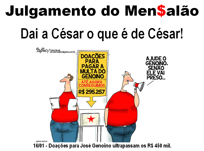 Na segunda-feira, 06 de janeiro de 2014, a Vara de Execuções Penais de Brasília determinou que o ex-deputado José Genoino (PT/SP), condenado na Ação Penal 470, processo do Mensalão, pague até o próximo dia 20 a pena de multa no valor de R$ 667,5 mil (já corrigidos monetariamente) que ele recebeu pela condenação por corrupção, caso contrário o débito será incluído na Dívida Ativa da União. “Cumpanheiros vamo correr a sacolinha”, implora Lula pelo site arrecadador.