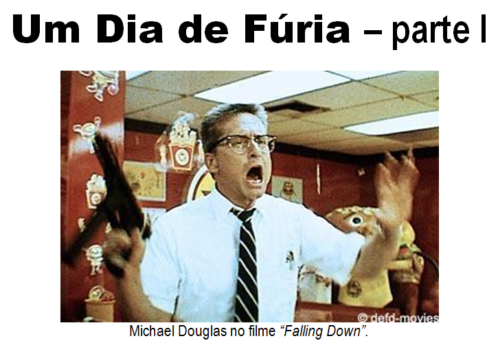 A maioria das pessoas, com as quais eu converso, já assistiu ao filme “Falling Down” (Drama, suspense dos Estados Unidos e da França, datado de 1993, produzido por Joel Schumacher, tendo no elenco os famosos atores Michael Douglas e Robert Duvall). O enredo de “Um Dia de Fúria” foi marcante e a cena da lanchonete foi comentada milhares de vezes em seminários de Marketing, inclusive por mim. Passados 21 anos, eu poderia dizer que também tive o meu dia, digamos, “Um Dia de Raiva”, depois de participar de dois episódios como ator coadjuvante interpretando o papel de vítima – ambos os casos aconteceram no Brasil, num dia de sábado, 10 de janeiro de 2014, em ambientes realistas, portanto, não fictícios, muito embora a vida continue imitando a arte. Ou será que a arte reproduz exatamente a vida? Vamos ao primeiro episódio.