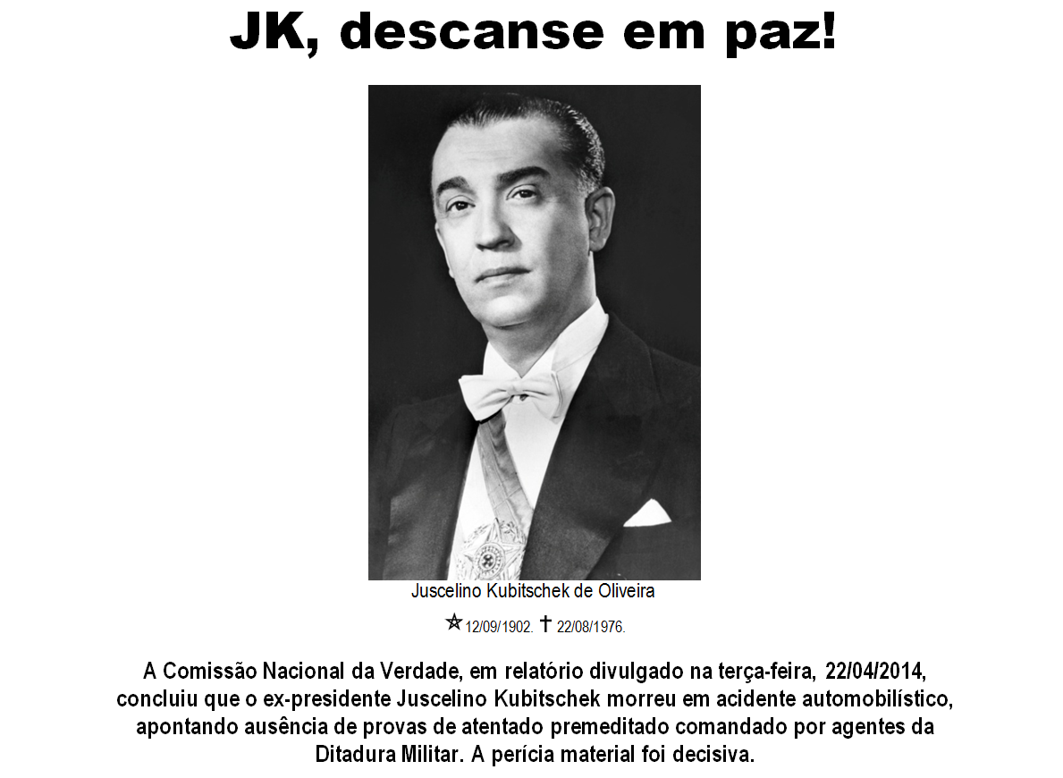 Retrospectiva: Em 1996, portanto, há exatos 20 anos depois da sua morte, o corpo de Juscelino Kubitschek foi exumado. O laudo oficial da exumação concluiu, ratificando, que a “causa mortis” foi decorrente de acidente de trânsito. O secretário particular de JK, Serafim Jardim, contestou esse Laudo Pericial, opinião documentada em seu livro “JK – Onde está a verdade?”, Editora VOZES. Em 2001, o empresário e ex-deputado Paulo Octávio (PP), marido da neta de JK (Anna Christina Kubitschek Barbará), requereu à Câmara dos Deputados uma Comissão Externa com a finalidade de averiguar as “suspeitas” de assassinato do ex-presidente Juscelino Kubitschek. O pedido foi atendido. Parte do relatório final da Comissão Externa: “Por mais que se exercite a imaginação e a criatividade, não se consegue encontrar um argumento sólido, balizado, lógico e técnico que possa apoiar a tese de assassinato… Os menores detalhes não passaram despercebidos. Investigamos todas as dúvidas, todas as suspeitas. À medida que as questões foram sendo esclarecidas e respondidas, a conclusão foi-se impondo inexoravelmente. Ao final destes trabalhos, não restam mais dúvidas de que a morte de Juscelino Kubitscheck foi causada por um acidente automobilístico, sem qualquer resquício da consumação de um assassinato encomendado”. Em 2012, a Comissão Nacional da Verdade, criada pela Lei nº 12.528/2011, e instituída pelo governo federal em maio de 2012, com a finalidade de apurar as graves violações dos Direitos Humanos, crimes políticos ocorridos entre 18 de setembro de 1946 e 05 de outubro de 1988, resolveu analisar o inquérito sobre a morte de JK. A CNV, então, abriu investigação com base no pedido formulado pela OAB – Ordem dos Advogados do Brasil de Minas Gerais. Material periciado: 150 negativos de fotografias que estavam arquivados no Rio de Janeiro; o forro do caixão no qual foi enterrado o motorista e também amigo de JK, Geraldo Ribeiro; as lâminas originais das tintas retiradas dos veículos envolvidos no acidente, ou seja, do Opala, da carreta e do ônibus, entre outros itens periciados que originaram a perícia material conclusiva. Outubro de 2013, a família do ex-presidente Juscelino Kubitschek descartou qualquer hipótese de uma nova investigação, que provoque outra exumação de seus restos mortais, sobre as condições em que morreu naquele fatídico acidente. Segundo a família, a morte de JK já foi exaustivamente investigada pelas autoridades brasileiras, logo após o acidente e em inquéritos independentes, a exemplo do que foi conduzido pela Câmara dos Deputados por solicitação do ex-Deputado Federal Paulo Octávio, que, à época, admitiu havia quem realmente desejasse a morte de JK, daí a desconfiança nas investigações preliminares. As perícias concluíram que o corpo de Juscelino não apresentava qualquer ferimento além dos provocados pelo choque do Opala com a carreta. A família esperava que uma pá de cal fosse jogada sobre o episódio. Também, em outubro de 2013, a Comissão Municipal da Verdade de São Paulo ouviu o ex-motorista de ônibus Josias Nunes de Oliveira, envolvido diretamente no acidente que causou a morte do ex-presidente da República Juscelino Kubitschek e do seu motorista. Segundo ele, no dia 22 de agosto de 1976, dirigia um ônibus da Viação Cometa na Rodovia Presidente Dutra, sentido São Paulo/Rio de Janeiro, quando o Opala, em que estava JK, cruzou a frente do ônibus e foi parar na pista de sentido contrário, colidindo de frente com um caminhão. “Eu estava na faixa da esquerda e o carro de JK estava na da direita, em uma velocidade um pouco maior que a minha. De repente, tinha uma curva leve para a direita e o motorista do Juscelino continuou em linha reta. Como naquela época a Dutra não tinha guard rail, o carro atravessou a pista sem o menor problema. […] JK não morreu logo depois da batida, ele chegou a mexer os olhos. Eu não o reconheci logo de primeira. Ele estava no banco de trás com o livro ‘As Mudas se Levantam’, e eu só descobri que era o ex-presidente quando vi uns documentos que caíram de uma pasta. […] Minha vida piorou bastante. O mundo inteiro me acusou de criminoso. Alguns dias depois do acidente, dois caras cabeludos que se diziam repórteres foram até a minha casa e ofereceram uma grande quantia de dinheiro para que eu assumisse a culpa pela morte do Juscelino. Se eu não aceitasse, eles disseram que iriam bater em mim. Eu não aceitei o dinheiro, e eles nunca mais me procuraram. Não lembro o nome deles e nem de qual veículo eram”. Anos depois, o ex-motorista de ônibus Josias Nunes de Oliveira foi apontado e processado como o responsável pelo acidente, porém, foi inocentado no julgamento. Em 09 de dezembro de 2013, a Comissão Municipal da Verdade Vladimir Herzog (jornalista assassinado sob tortura no DOI-CODI em 1975), criada em São Paulo, informou a sua conclusão dando conta que o ex-presidente Juscelino Kubitscheck foi realmente assassinado, creditando o ato à Ditadura Militar. Em 22 de abril de 2014, após investigações que duraram dois anos, a Comissão Nacional da Verdade chegou à conclusão que a morte de JK foi causada por acidente, portanto, o ex-presidente não foi assassinado, não foi vítima de um atentado planejado, de modo que o governo militar (1964/1985) não teve nada a ver com isso. “Não há nos documentos, laudos e fotografias trazidos para a presente análise qualquer elemento material que, sequer, sugira que o ex-presidente Juscelino Kubitschek de Oliveira e Geraldo Ribeiro (motorista de JK) tenham sido assassinados, vítimas de homicídio doloso. […] O conjunto de vestígios materiais indica que o ex-presidente Juscelino Kubitschek de Oliveira e Geraldo Ribeiro morreram em virtude de um acidente de trânsito”. O laudo do local do acidente, confeccionado pelo perito criminal Sérgio Leite, foi decisivo para a Comissão Nacional da