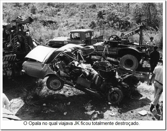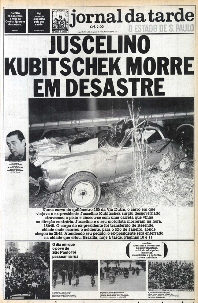 Era 18h40min do dia 22 de agosto de 1976, quilômetro 165 da Rodovia Presidente Dutra, na altura da cidade fluminense de Resende, Estado do Rio de Janeiro, Juscelino Kubitschek de Oliveira e o seu motorista Geraldo Ribeiro estavam mortos. Tese da época: Ambos foram alvo de uma conspiração de assassinato. Versão oficial divulgada pelas autoridades: Foi um casual acidente automobilístico. Fato inquestionável: O Chevrolet Opala, placa NW-9326/RJ, no qual os dois viajavam, bateu de frente, violentamente, em uma carreta Scania-Vabis, placa ZR-0398/SC, carregada de gesso, provocando as mortes instantâneas. O local em que ocorreu o acidente, atual quilômetro 328, é conhecido como “Curva do JK”, antes era conhecido como “Curva do Açougue” – melhor ter permanecido com o nome original, face à dramaticidade do evento. Mera fatalidade? O conjunto das circunstâncias foi determinante. Na hora, não havia como operar milagres! A tragédia, que durou segundos, interrompeu, talvez, algo de muito importante que se desenhava acontecer no cenário político do país.