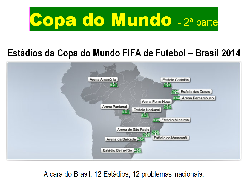 O dia, a hora e o local da tão esperada festa já estão marcados, quinta-feira, 12 de junho de 2014, 17h00min, Arena de São Paulo, Estádio do Corinthians, Itaquerão. O espetáculo maior ficará por conta do jogo Brasil x Croácia. Ninguém fala sobre a festa menor de abertura da Copa do Mundo. Será surpresa. Desagradável ou não também ninguém sabe. Há quem arrisque um palpite: desfile dos políticos brasileiros ao som da marchinha de Carnaval “Me Dá Um Dinheiro Aí”. No carro “Abre Alas” a presidente Dilma Rousseff ao lado do seu cúmplice e padrinho político Lula, o presidente da FIFA Joseph Blatter ao lado do presidente da CBF José Maria Marin. Disputam as poucas vagas nesse carro o contador de dinheiro Ricardo Teixeira, o secretário-geral da FIFA Jérôme Valcke e o ministro dos esportes José Aldo Rebelo Figueiredo (PC do B). Confetes e serpentinas serão jogados ao ar em meio à poluição paulistana.