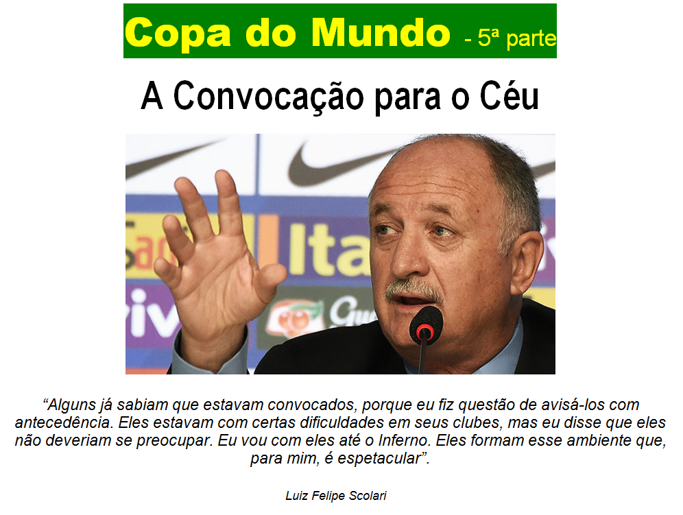Mais uma frase de efeito, com a assinatura do Felipão, dita por ele numa entrevista coletiva acontecida na casa de show ‘Vivo Rio’ (Avenida Infante Dom Henrique nº 85, Aterro do Flamengo, Rio de Janeiro), na quarta-feira, 07/05/2014, dia que anunciou orgulhosamente os nomes dos 23 jogadores convocados para servir ao país. Uma reunião de palavras que deram o sentido de “firmamento” para esses escolhidos jogadores. Uma convocação anunciada. Não quero prever circunstâncias adversas ou desastrosas, porém, sinistros podem acontecer até o dia 12 de junho. Como não sou agourento, de modo que não estou afirmando que os sinistros ocorrerão. O ônibus que transporta a Seleção brasileira pode furar todos os pneus no mesmo instante, o que seria algo sem explicação. Como seria algo explicável a invasão da Granja Comary, local de concentração da Seleção, por manifestantes, que torcem por um Brasil sem chuteiras, apenas decente, livre de corrupção, com igualdade social.