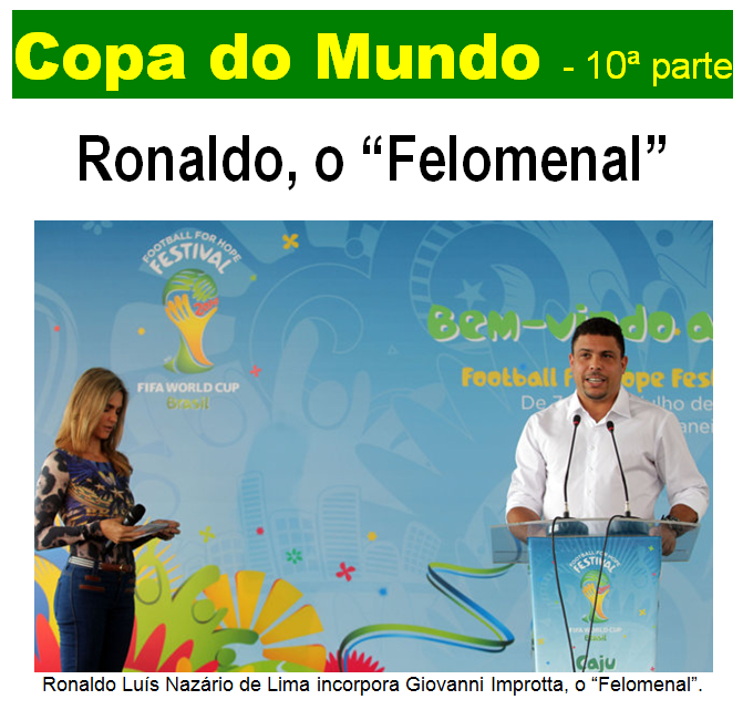Ronaldo Luís Nazário de Lima – Ronaldo, Ronaldo Fenômeno ou ainda Ronaldinho – é um ex-atacante de futebol e agora atua como “Atacante Político”. Em evento realizado no mês passado, e depois na imprensa, Ronaldo incorporou Giovanni Improtta, o “Felomenal”, reafirmando com todos os “pingos” e “is” que sente vergonha do Brasil e que a Copa do Mundo é vítima do governo federal. Demorou. De todo ele não está errado, de modo que não podemos culpá-lo e crucificá-lo pelo que declarou. Costumo dizer que Deus, na sua infinita misericórdia, deu a burrice ao homem totalmente indolor, porque, meus amigos leitores, se a burrice doesse, o Brasil não dormia, tamanha a gritaria. Ronaldinho é a cópia fiel do apolítico brasileiro que se mete na política para se dar bem, seja garimpando reconhecimento, seja colhendo falsos elogios, seja formando grupos de amigos hipócritas, seja corrompendo-se em nome do governo, ainda que não receba em espécie. O mais novo Giovanni Improtta, o “Felomenal”, que, por merecimento, é (ou foi) membro do Comitê Organizador Local (COL) responsável pelos preparativos para a Copa do Mundo FIFA 2014. O “Felomenal” é a cara do Brasil, a cara de Brasília, cagado e cuspido político brasileiro, que não faz porra nenhuma e ainda fala merda com a maior desenvoltura – foda-se se vai comprometer alguém.