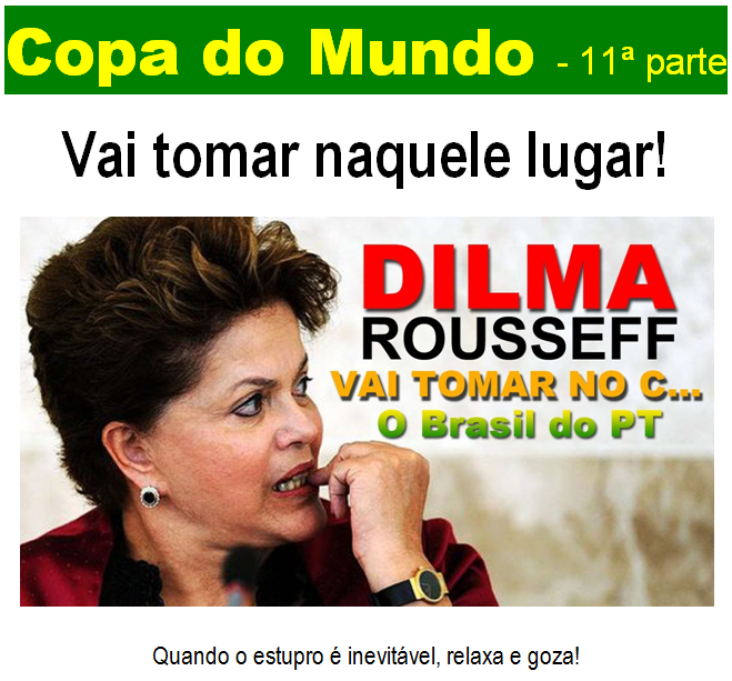 Copa do Mundo FIFA 2014, quinta-feira, 12 de junho, jogo de abertura Brasil x Croácia, Arena de São Paulo (Itaquerão), 62.000 pessoas mandaram solenemente Dilma Rousseff ir tomar naquele lugar. Se ela foi depois do jogo não fiquei sabendo, mas ela saiu do Itaquerão com as calças cagadas, isso eu posso garantir a vocês. Está virando moda o povo mandar os políticos “Tomar no CU”. Eu apoio o movimento, afinal, quem só estava tomando na bunda até agora era o povo, que enxergou a hora de mudar de posição. Como aqui não é Portugal onde na suruba de dois só um come e o outro só dá o rabo, o troca-troca faz parte da sacanagem brasileira – um pouquinho cada um. Recomendo Dilma Rousseff comprar a pomada Hipoglós para proteger a delicada pele da bunda em caso de assaduras. Leia-se: “A sua fórmula é única, com vitaminas A (Retinol) e D (Colecalciferol), incorporadas a agentes penetrantes, emolientes e hidratantes, formando uma camada protetora contra substâncias presentes nas fezes e na urina que causam assaduras” – desse modo, quando a “pica” entrar, Dilma pode cagar e mijar à vontade. Sugiro também que antes da penetração Dilma use KY Gel Lubrificante Íntimo 50g porque um desses torcedores que a mandaram “Tomar no CU” pode fazer parte da ala descontente do PMDB.
