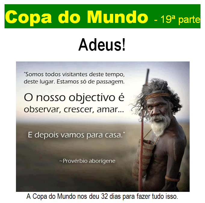 Continuamos achando que está tudo legal com o Brasil, com a Copa, com os nossos visitantes. Pensando bem, não poderia ser diferente, porque o efeito anestésico causado pelo futebol nos conduz para fora da realidade – a mídia sabe disso e trabalha nesse sentido. Depois que a ficha cair talvez mude alguma coisa, e também se não mudar não tem a menor importância. A melhor percepção é aquela manifestada pelos roedores, porque sabem a hora certa de sair da toca pra comer o queijo – isca manjada. A presidente da Copa & Cozinha, Dilma Rousseff, a mais vaiada do mês de julho, deve estar arrependida por ter dito que esta seria a “Copa das Copas”; uma Copa política que revelou ao mundo como anda a nossa desprezível política; uma Copa das incompetências; uma Copa de altíssimo custo social e contabilidade forjada. Para os organizadores da festa os objetivos maiores eram o lucro, a promoção própria, deixar a casa suja e plantar a semente que germinará novos eventos que produzam os mesmos frutos e idênticos efeitos. Para o restante do povo brasileiro, que não participou do festim licencioso, coube a tarefa de catar latinhas vazias, colocar as coisas nos seus devidos lugares segundo necessidades orgânicas. A cultura plural e heterogênea foi embora, partiu para os continentes de origem, não obstante, deixou para trás alguns ensinamentos que não serão aproveitados porque a nossa cultura é outra, é singular, mesmo assim agradecemos de coração – foi bom o convívio enquanto durou. Fomos mais observados do que observamos. Não, não há dúvida.