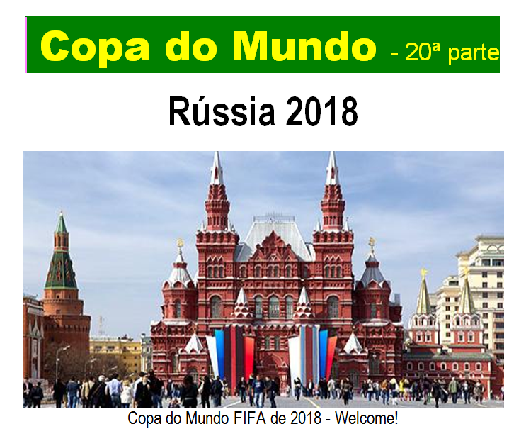 Кубок мира ФИФА 2018. O período de realização da XXI edição do Campeonato Mundial de Futebol FIFA será de 08 de junho a 08 de julho. Serão 32 Seleções participantes distribuídas em oito Grupos. A FIFA escolheu a Rússia como país-sede no dia 02 de dezembro de 2010 – a primeira vez que um país do Leste Europeu sediará o evento. Até lá muita coisa estará em jogo e não podemos prever com tanta antecedência todos os acontecimentos, porém, duas coisas nós podemos antever desde já: primeira, o aumento da produção, comercialização e consumo de Vodka (em russo во́дка); segunda coisa, a prática de corrupção ‘Made in Rússia’ segundo padrão FIFA. Enquanto isso, a corrupta instituição FIFA deu o tradicional aperto de mãos (e beijinhos) na Máfia Russa, com o propósito de acertar a participação de cada uma das partes nos resultados financeiros da Copa e nas negociatas paralelas. Por sua vez, o presidente da Rússia, Vladimir Vladimirovitch Putin, deve empregar toda a sua experiência adquirida quando foi agente do KGB (Komitet Gosudarstvennoi Bezopasnosti) e chefe dos serviços secretos da União Soviética e da Rússia (KGB e FSB – Federal’naya Sluzhba Bezopasnosti Rossiyskoi Federatsii) para eliminar qualquer obstáculo que impeça a Seleção da Rússia de participar da Final da Copa no dia 08 de julho de 2018 – isso se os mísseis disparados da Ucrânia não destruírem os Estádios antes.