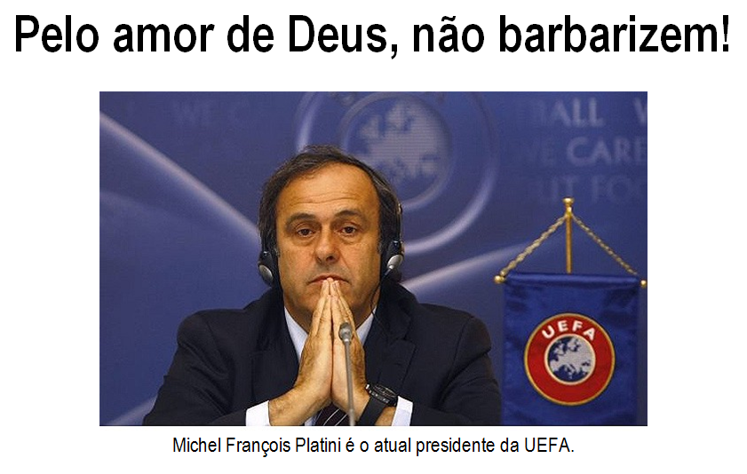 Platini foi um dos maiores futebolistas da França, mas o objetivo aqui não é falar do seu vasto currículo – até porque Michel Platini dispensa comentários nessa questão. O momento é para relembrar o que ele falou aos brasileiros há três meses, assumindo o papel de porta-voz da FIFA, entidade preocupada com o que poderia acontecer durante a Copa do Mundo de 2014, caso as manifestações populares tomassem conta das ruas por todo o Brasil, a exemplo do que ocorreu durante o período de realização da Copa das Confederações de 2013, quando os protestos antigoverno e contra a realização da Copa do Mundo no Brasil quase inviabilizaram aquele evento. Com a sua cara de padeiro francês, Platini pediu aos brasileiros que deixassem os protestos para depois da Copa do Mundo, ou seja, que a partir do dia 14 de julho – um dia depois da Final no Maracanã – os românticos manifestantes estariam liberados para trocar a fantasia e entrar no bloco da arruaça.