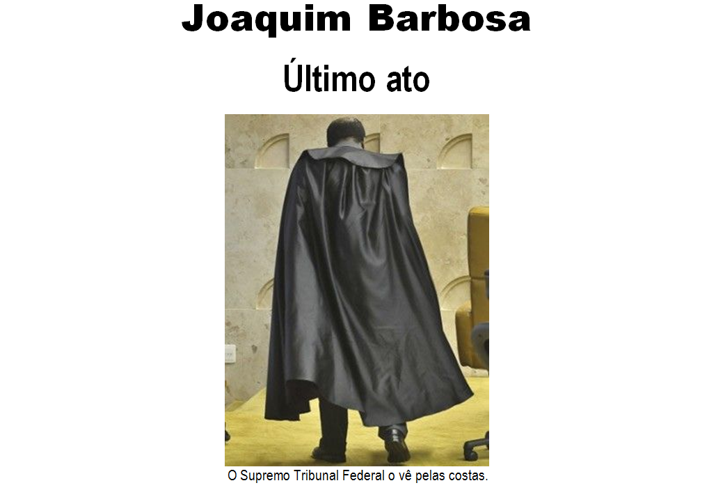 Sem os acordes da guitarra do Ministro Luiz Fux, que cantou Tim Maia durante jantar oferecido pelas Associações dos Magistrados em comemoração à posse de Joaquim Barbosa em 22 de novembro de 2012 como presidente do STF, a sua despedida na terça-feira, 01 de julho de 2014, aconteceu de maneira discreta, sem pronunciamento aos pares e à nação. Um dia envolto em simbolismos; a última sessão por ele apregoada diretamente da cadeira de presidente do STF ficará marcada na história daquela “Casa de Justiça”. Uma saída esperada na Praça dos Três Poderes da República, justamente no momento em que a atenção da população brasileira esteve totalmente voltada para a Copa do Mundo FIFA 2014, de modo que as coisas de relevância que aconteciam no país não foram percebidas, senão em redutos restritos, em cenários particulares.