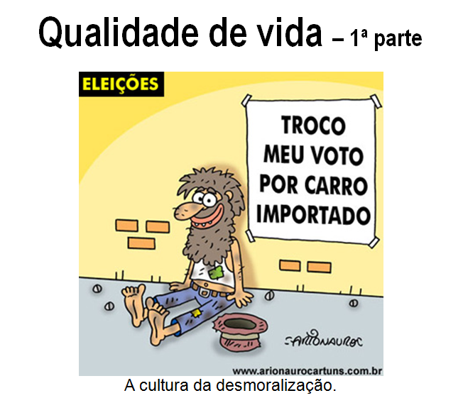 O 1° turno das eleições ocorrerá no dia 5 de outubro de 2014 e o 2° turno será no dia 26, vinte e um dias depois. No intervalo entre as duas datas mobilizam-se as “costureiras” para as indispensáveis costuras políticas de base. O importante é que os políticos se comprometam com uma agenda positiva a partir da pauta de reivindicações: Saúde, Segurança, Emprego e renda, Educação, entre outras necessidades básicas como Moradia, Alimentação, Transporte. O cidadão precisa de uma identidade (conjunto de caracteres próprios e exclusivos), ser qualificado e respeitado como tal. O pleno exercício dos direitos e deveres civis, políticos e sociais, prescritos na Constituição do país, depende exclusivamente do espírito de Cidadania – cada indivíduo deve se considerar um agente público, jamais um “objeto de dominação”, portanto, cumprir obrigações e exigir direitos são práticas inalienáveis que o colocam a um passo da liberdade. Qualidade de vida engloba tudo isso, de modo que o “Princípio da dignidade da pessoa humana” é decorrência direta, e constitui o princípio máximo do Estado Democrático de Direito.