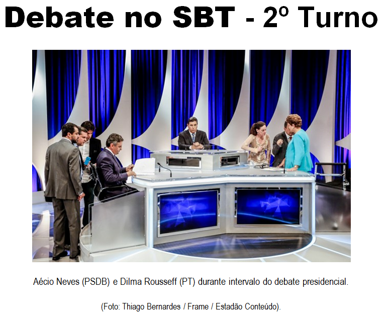 1O Sistema Brasileiro de Televisão (SBT) promoveu nesta quinta-feira, 16 de outubro de 2014 – evento também organizado pelo Portal UOL e pela rádio Jovem Pan –, o segundo debate com os dois candidatos presidenciáveis neste 2º Turno das Eleições 2014, Aécio Neves (PSDB) e Dilma Rousseff (PT). Um confronto esperado dentro das expectativas, carinhos, elogios, beijos e abraços, confraternização, reconhecimento público de ambas as partes, pelo menos essa foi a análise feita pela “esmagadora” maioria dos eleitores petistas ávida por derramamento de sangue ao vivo e a cores no horário das 18h00min quando algumas emissoras brasileiras de rádio transmitiam a oração da “Ave Maria”. Ao final do debate tivemos que rezá-la pelo menos umas dez vezes como manda o terço; o “Pai Nosso” deixamos quieto no céu.