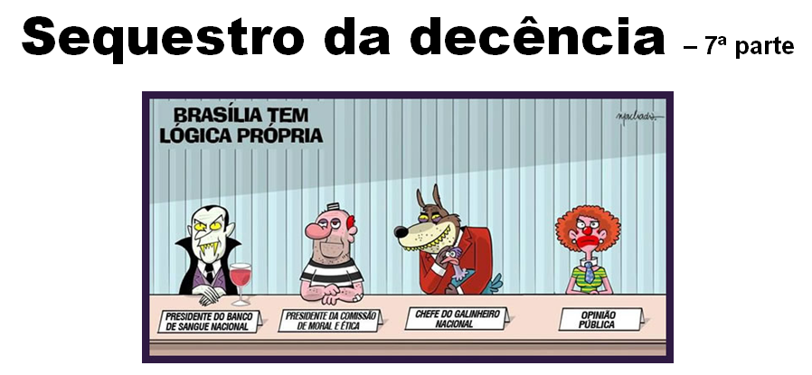 Para irritação dos governistas, volto a reafirmar que o Brasil é um paraíso de ladrões, e também de espertalhões. Não há Lei que balize essas práticas, o roubo e a esperteza, só as práticas fazem as normas. Essas práticas também “fazem escola” para os novatos que chegam ao covil político com tendências explícitas e bem definidas para roubar e para ser esperto – não significa, necessariamente, que essas ações aconteçam simultaneamente; o “Chefe do Galinheiro Nacional”, espertamente, manda alguém roubar por ele e para ele, enquanto a “Opinião Pública” se diz esperta e confessa que nunca roubou. Os dois presidentes, do Banco de Sangue Nacional e da Comissão de Moral e Ética, na espreita, torcem para que sobre algo de bom para eles, e geralmente sobra, porque assumem que são bobos e honestos.