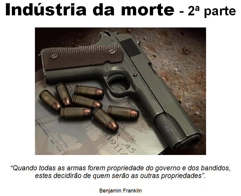 Matar pode se transformar em ato contínuo; armas não são bens de consumo, mas objetos de intimidação. Sempre, o aspecto educacional-cultural será determinante no estabelecimento de divisores de águas. Temos nas mãos uma bomba de efeito moral; decisões governamentais não surtem os efeitos morais esperados. Aqui no Brasil, o governo federal achou que tirando as armas de fogo das mãos dos “cidadãos de bem” resolveria quase que totalmente o problema da violência, diminuiria o índice de homicídios por armas de fogo, aproximaria os brasileiros da crença em Deus, tornando-os menos vulneráveis. Esta decisão do governo Lula, esta sim, é um romance digno de Best Seller. Dois pesos e duas medidas, um tiro no pé, outro na testa. Que se dane a violência dos outros. Aliás, os militares deveriam ter questionado o governo federal sobre os Programas de Desarmamento da população, deveriam levantar o que estava por trás dos programas, quais as razões, quais as suas reais intenções, de modo que é sabido, o governo brasileiro (PT) está alinhado politicamente com Cuba e Venezuela e outros territórios bolivarianos, onde a democracia é questionável e um sonho distante, por serem países ditatoriais e por promoverem abertamente uma política de exceção, ameaçando a liberdade e os direitos civis. Liberdade? Direitos civis? A população virou refém de si mesma. Volto à citação de Benjamin Franklin.