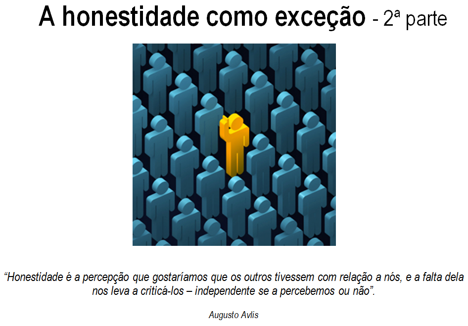 Honestidade é a percepção que gostaríamos que os outros tivessem com relação a nós, e a falta dela nos leva a criticá-los – independente se a percebemos ou não. Nada funciona no Brasil que não seja à base de corrupção, até as religiões aderiram à causa da desonestidade. O Brasil está de pernas pro ar, o mundo está de cabeça pra baixo, olhando para a direita vemos problemas, olhando pra esquerda é a mesma coisa, pra frente e pra trás a situação piora. Se Cristo ainda existe na sua forma não-corpórea certamente deve estar preocupado com a possibilidade de reencarnar na Terra. Há quem defenda uma terceira guerra global para que ocorra uma “limpeza ética-moral” da humanidade – se houver sobreviventes (contando comigo) e estes aprenderem a lição talvez eu venha a compactuar com essa ideia maluca. Pensando bem não tão maluca assim. Uma nova ordem social se desenha como necessária.